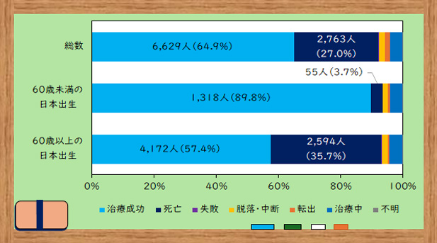 日本における結核の治療成功率は、60歳未満の日本出生の結核患者においては80%以上です(図1)。しかし、60歳以上の日本出生の結核患者における治療成功率は60%以下で、死亡率は30%を超えています。日本においては結核患者に占める高齢者の割合が高く、高齢者を中心に毎年1,700人近くの方が結核で亡くなっています。